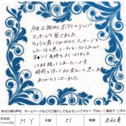 【 リンパトリートメント 】 今日は初めてボディのリンパマッサージを受けました。 ちょうど、肩こりがひどくマッサージをしたいな と思っていたところでしたので すごく気持ちよくなりました。 このまま眠ってしまいたいです。 時間を作ってまた来たいと…