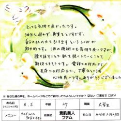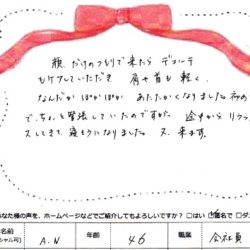 【 デリケートフェイシャル(フェイス~ネック)】 気持ちが使用前使用後で別人に成りました。 スッキリ。ありがとう! N 【 ファムからのメッセージ 】 N様 この度はファムをご利用いた…