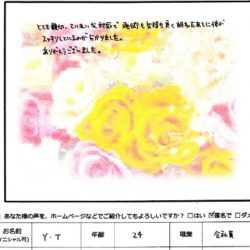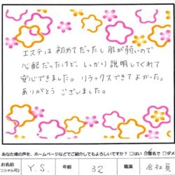 【 デリケートコース(フェイス~ネック) 】 エステは初めてだったし肌が弱いので心配だったけど しっかり説明してくれて安心できました。 リラックスできてよかった。 ありがとうございました。 Y.S 32歳 会社員 …