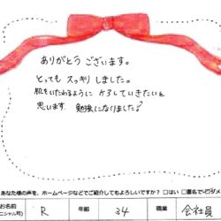 【 スペシャルフェイシャル(フェイス~デコルテ)】 ありがとうございます。 とてもスッキリしました。 お肌をいたわるようにケアしていきたいと思います。 勉強になりました! R 34歳 会社員 【 ファム…