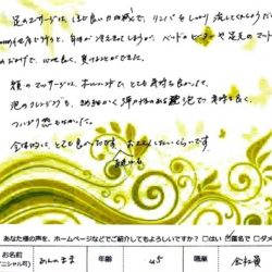 【 スペシャルフェイシャル(フェイス~デコルテ)】 ・とても気持ち良く寝てしまいました ・お店もとてもきれいでリラックスできました。 ありがとうございました。 I 30代 【 ファムからのメッセージ 】 …