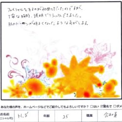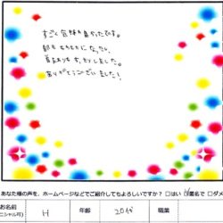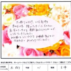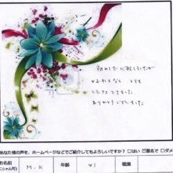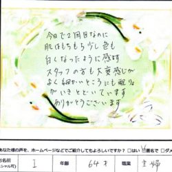 【スペシャルフェイシャル】 (フェイス~デコルテ) すごく気持ち良かったです。 肌ももちもちになったし、 首まわりもすっきりしました。 ありがとうございました! H 20代 【ファムからのメッセージ】 K・S 様、 初め…