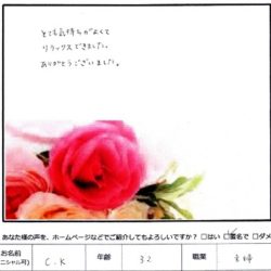 【毛穴の汚れ引き締めフェイシャル】 (フェイス~デコルテ) とても気持ちがよくて リラックスできました。 ありがとうございました。 C・K 32歳 主婦 【ファムからのメッセージ】 C・K 様、 この度は、…