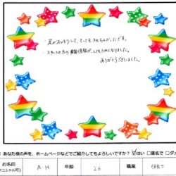 【美脚スッキリコース】 足がスッキリして とってもきもちよかったです。 スタッフの方の 美容情報がとてもためになりました。 ありがとうございました。 A・H 26歳 保育士 A・H 様、 この度はファムをご利用いただきまして、 誠にありがとう…