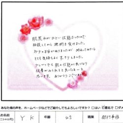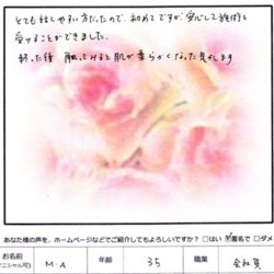 【スペシャルフェイシャル】 (フェイス~デコルテ) 初めてで心配しましたが かぶれなく とてもリラックスできました ありがとうございました M・K 41歳 【ファムからのメッセージ】 M・K様、 この度は ファムをご利用いただきまして、 …