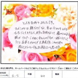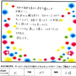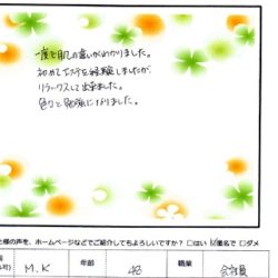 【スペシャルフェイシャル】 (フェイス~デコルテ) 一度で肌の違いが分かりました。 初めてエステを経験しましたが リラックスしてできました。 色々と勉強になりました。 M・K 48歳 会社員 【ファムからのメッセージ】 M・K様、 この度は …