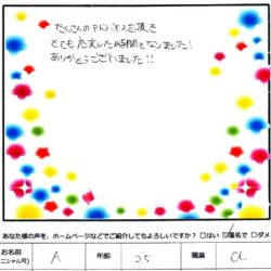 【スペシャルフェイシャル】 (フェイス~デコルテ) たくさんのアドバイスを頂き とても充実した時間となりました! ありがとうございました。 A 25歳 OL 【ファムからのメッセージ】 A 様、 この度はファムをご利用いただきまして、 誠にあ…