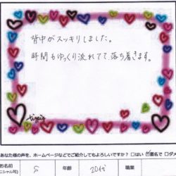 【リンパトリートメント】 (フェイス&ボディ) 背中がスッキリしました。 時間もゆっくり流れてて、落ち着きます。 S 20代 【ファムからのメッセージ】 S 様、 この度は ファムをご利用いただきまして、 誠にありがとうございます。 トリートメ…