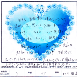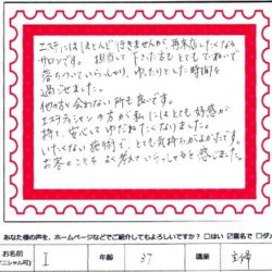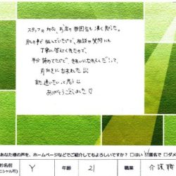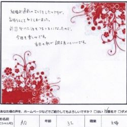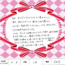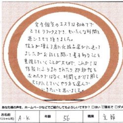 【リンパトリートメント】 (フェイス&ボディ) ここの技術はとっても上手で 中国でやったより気持ちよいのです。 大満足です。 接客もとても丁寧なので癒します。 李 彩亗 54歳 主婦 【ファムからのメッセージ】 李 様、 …