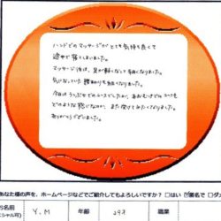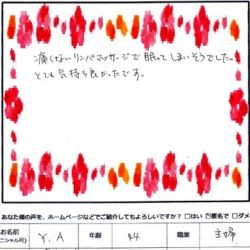 【リンパトリートメント90分】 とっても、とっても気持ちよかったです。 足のむくみがひどく 固くなっていた足が とても やわらかくなりました。 次回も楽しみです。 ありがとうございました。 Y・K 40歳 看護師 【ファムからのメッ…