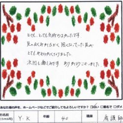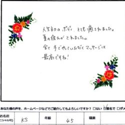 【リンパトリートメント】 (フェイス&ボディ) 人生初のボディ とても癒されました。 夏の疲れがとれました。 全て手でやっていただくマッサージは 最高ですね! K・S 45歳 【ファムからのメッセージ】 K・S 様、 この度…