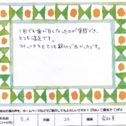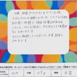 【歯のホワイトニング】 1回でも歯のホワイトニングでき、 とても満足です。 スタッフの方もとても親切で良かったです。 S・A 25歳 会社員 【ファムからのメッセージ】 S・A 様、いつもご利用いただき ありがとうございました。 素…