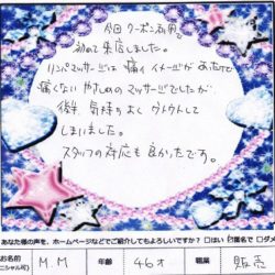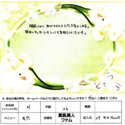 【ベーシックフェイシャル】 (フェイス) とにかく気持ち良かったです。 自分でやるのと 人にやってもらうもの 全然違うと感じました。 ぜいたくな時間をありがとうございました。 S・S 30歳 会社員 【ファムからのメッセージ】 …