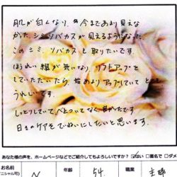 【毛穴ベーシックコース】 ① 肌の張りが出て驚きました。 ワントーンあがり嬉しいです。 ② 鈴木さんの優しい対応も心に栄養を頂ました。 ③ 肩こりもこれから良くなってほしいと思います。 &n…