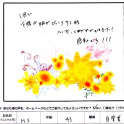 【スーパースレンダーMINI 120分】 1回で下腹がビックリする程へこみ、くびれができました! 感動です! M・S様 43歳 自営業 【ファムからのメッセージ】 M・S様 先日は はじめてのご来店、 誠にありがとうございました。 …