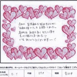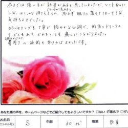 【リンパトリートメント60分】 (お疲れコース) 今日は育児の疲れを緩和するために “お疲れ様コース”をお願いしました! 肩まわりを気持ち良くケアして頂き すっかり眠ってしまいました(*^^*) いつもありがとうございます~!! O・Y 37歳 …