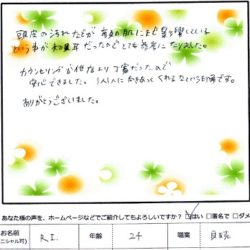 【メディカル毛穴の汚れ引締め】 (フェイス~デコルテ) とてもていねいに 時間をかけてしてくれました。 気持ち良くて ついついねてしまいました。 顔の色もすごく明るくなりました。 A・M 27歳 【ファムからのメッセージ】 A・M 様、…