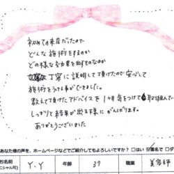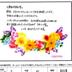 最先端の脂肪冷却痩身 【 ICEセルクラッシャー体験 】 接客もとても明るくて、沢山の アドバイスも頂け 感謝しています。 結果がでることを楽しみにしています。 Y 様 43歳 会社員 【ファムからのメッセージ】 Y…