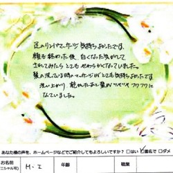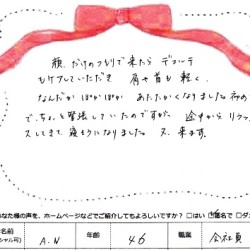 【スペシャルフェイシャル】 (フェイス~デコルテ) 前回同様 安定感のある施術が 心地良かったです。 ありがとうございました。 お茶が美味しかったです。 C・S 37歳 事務 …
