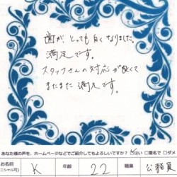 【ホワイトニング】 歯がとっても白くなりました。 満足です。 スタッフさんの対応が良くて またまた満足です。 K 22歳 公務員 【ファムからのメッセージ】 K 様、 この度は、ファムをご利用いただき ありがとうござ…