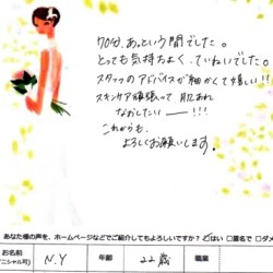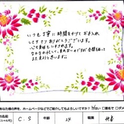 【スペシャルフェイシャル】 (フェイス~デコルテ) いつも丁寧に時間をかけてお手入れして下さり ありがとうございます。 心も体もいやされます。 なかなか忙しくて、来れないのですが 合間をぬって また来ようと思います!! C・S 24歳 …