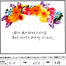 【スペシャルフェイシャル】 (フェイス~デコルテ) 1回でも肌が生きかえったようです。 幸せなひとときをありがとうございました。 E・M 65歳 主婦 【ファムからのメッセージ】 E・M 様、 初めてファムをご利…