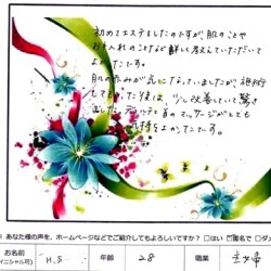 【ベーシックフェイシャル】 今回も、とても気持ち良く すっきりしました。 流れている音楽なども 心地よくしてくれていたと思います。 ありがとうございました! T・M 27歳 【ファムからのメッセ…