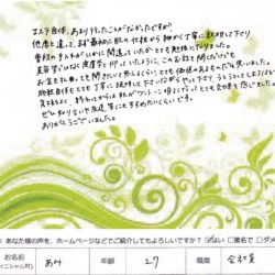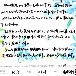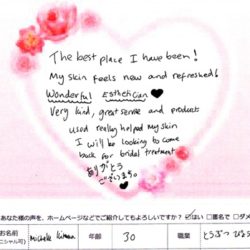 【スペシャル フェイシャルコース】 一対一でプライベートな空間で他のお客さんがいないため、 とてもリラックスできました。 施術後は肌がやわらかくなりました。 普段使用している化粧品を見直そうと思いました。 ありがとうございました。 …
