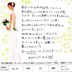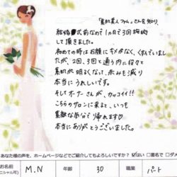 「素肌美人ファム」さんを知り、 結婚式前なので1か月で3回施術して頂きました。 初めてのときはお顔にキメがなく、くすんでいましたが、 2回、3回と通う内に段々と素肌が明るくなって、 赤みも減り本当に嬉しいです。 そしてオーナーさんがカッコイイ!! こちらのサロンに…